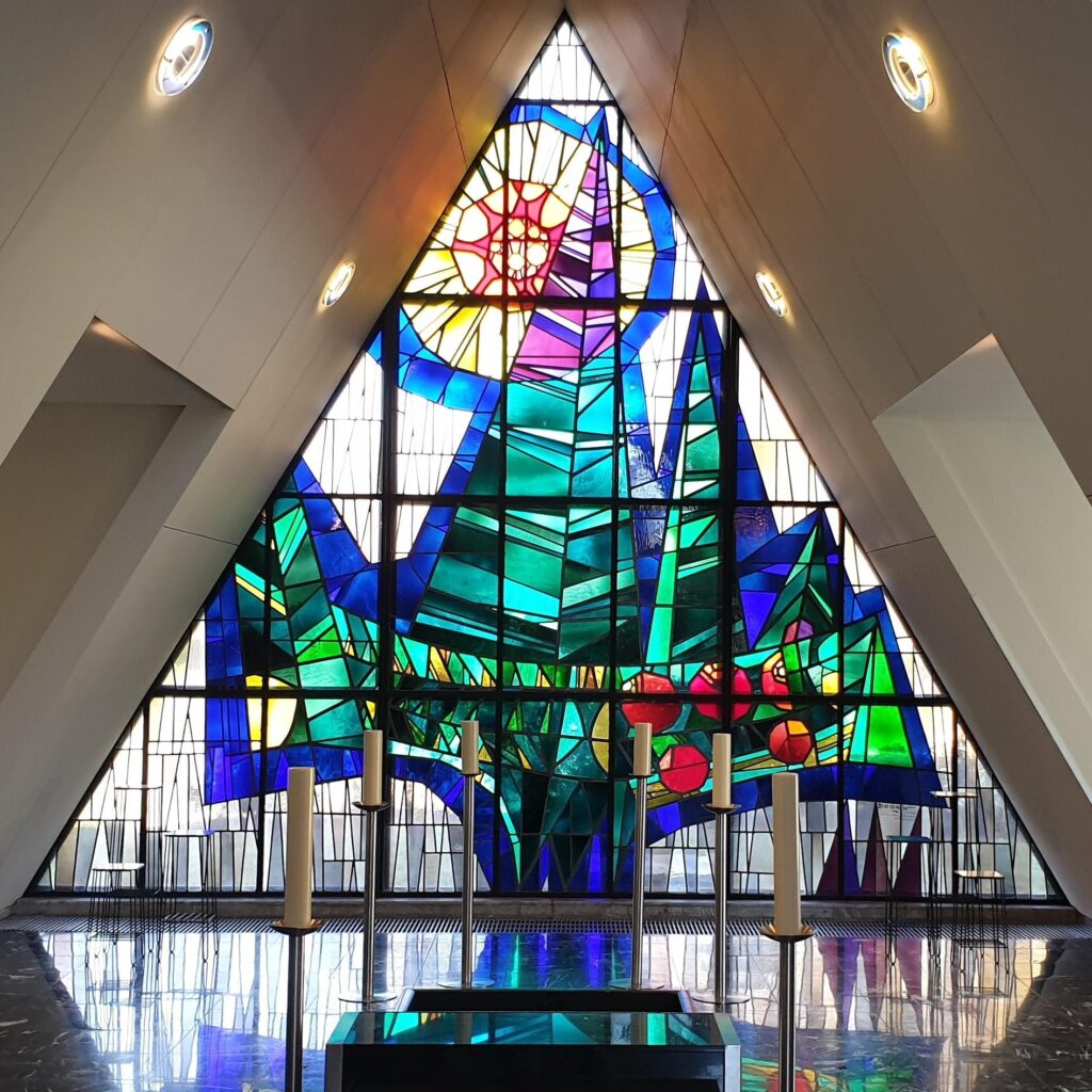 In de sobere, strakke architectuur loopt het dak door tot bijna aan de grond. Wie de aula’s binnenkomt, ziet aan het eind van het looppad, achter de plaats waar de kist met de overledene is opgesteld, een bijzonder driehoekig glasin-loodraam, opgebouwd uit zo’n vijfduizend gekleurde glassegmenten.