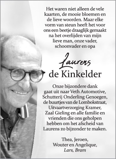 Terugkijkend en denkend aan deze uitvaart kan ik alleen maar dankbaar zijn dat er zo veel mensen zijn/ haar steentje hebben bijgedragen om het afscheid van Laurens zo bijzonder te maken. De familie, vrienden, de buurt, schutterij Onderling Genoegen, Carrosseriebedrijf Veth en Zaal Gieling Groessen. Een uitvaart verzorgen doe je niet alleen als uitvaartverzorger, dat doen we met een team. Dus zeker ook mijn achterban: het team van Uitvaartverzorging Kramer bedankt!