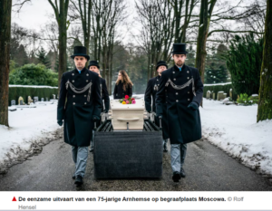 Het is een bijzonder gezicht. Vier dragers. Een uitvaartonderneemster, vergezeld door een beheerder van Moscowa voor de kist. De twee thuiszorgmedewerkers erachter. En dat is het. Onderweg luiden de klokken voor Marja. Het is even na negen uur op vrijdagochtend. Normaal zijn de eenzame uitvaarten nóg eerder op de dag, nu was er ruimte op een iets schappelijker tijdstip.